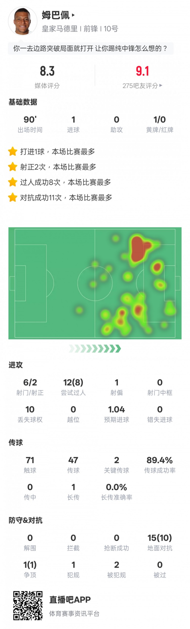 半岛体育app-姆巴佩本场比赛数据:1进球8过人成功11次对抗成功,评分8.3