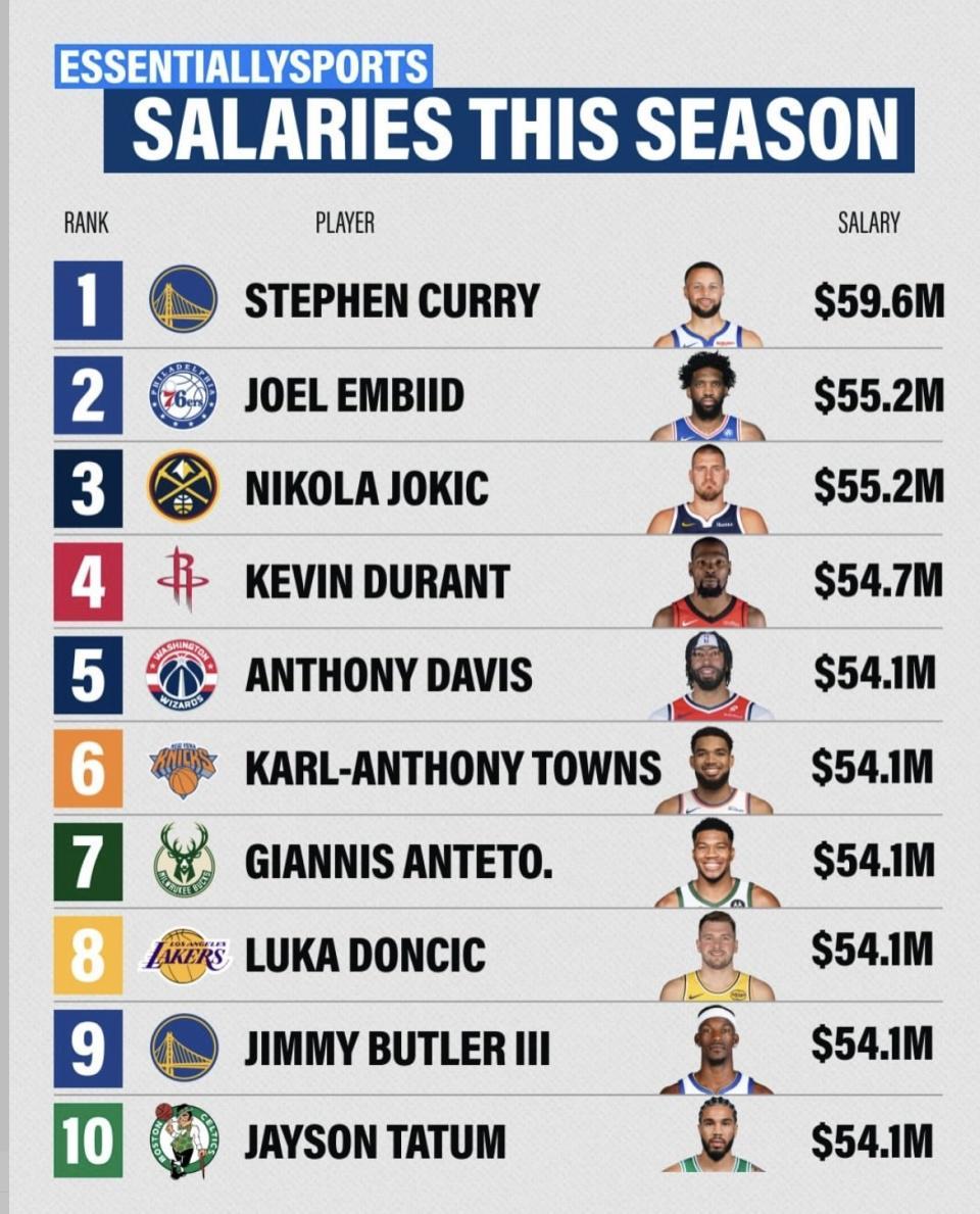 足球-NBA本赛季球员年薪榜发布!库里第一 4.12亿元!詹姆斯跌出前十