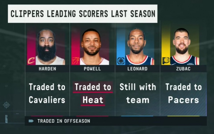 体育数据-快船上季四人组只剩小卡:哈登赴骑士 大祖去步行者 鲍威尔去热火